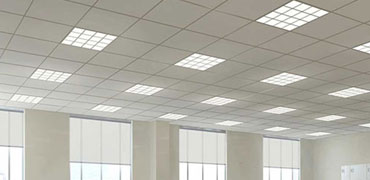 Features a metal grid framework supporting ceiling panels, providing a modular design for easy utility access and a modern look in offices and commercial buildings.